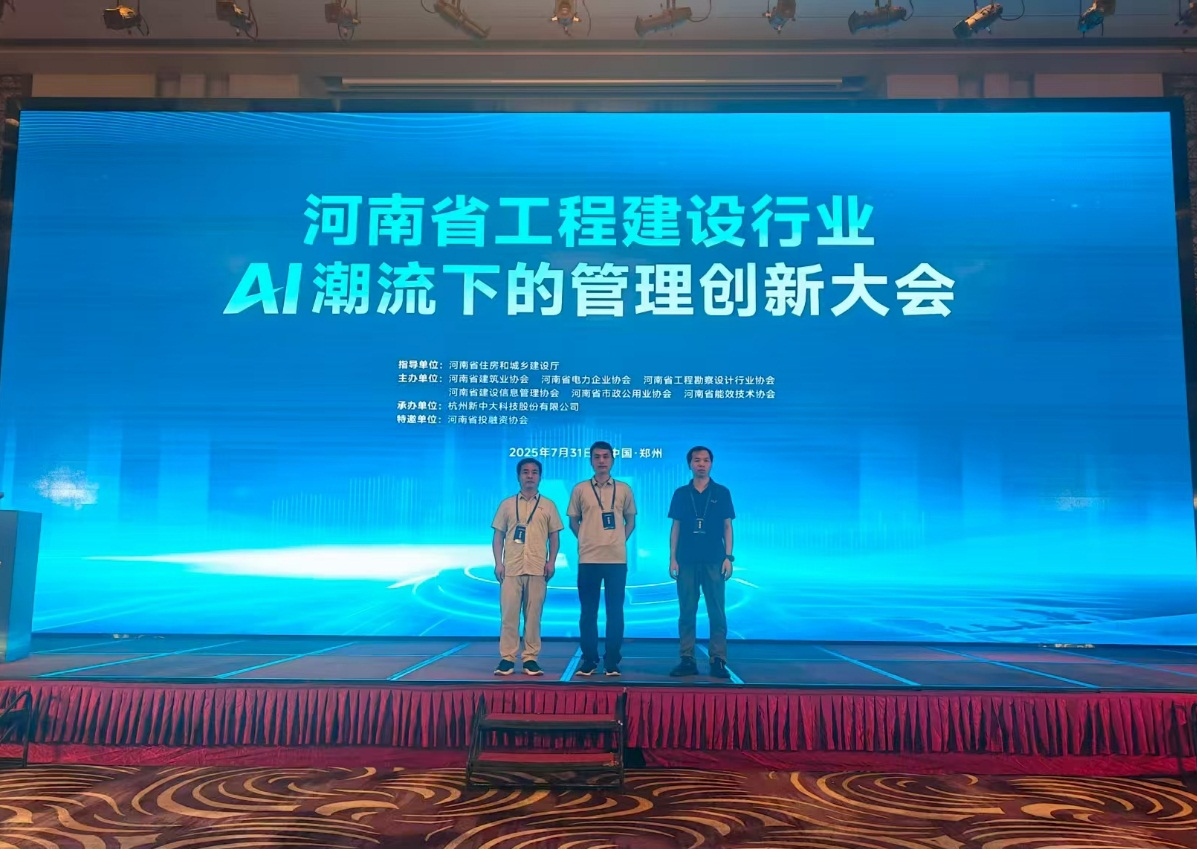 2025年7月31日,由河南省建筑业协会、河南省建设信息管理协会、河南省电力企业协会等六家单位联合主办,杭州新中大科技股份有限公司承办的“河南省工程建设行业AI潮流下的管理创新大会”在郑州隆重召开。来自协会、企业、高校的众多代表齐聚一堂,共议人工智能与建筑业深度融合的创新路径。公司建筑公司智能建造教研室主任李永涛、教师魏春龙、庞伟旺受邀参会,以高校视角探寻建筑业数字化转型对人才培养的新需求。