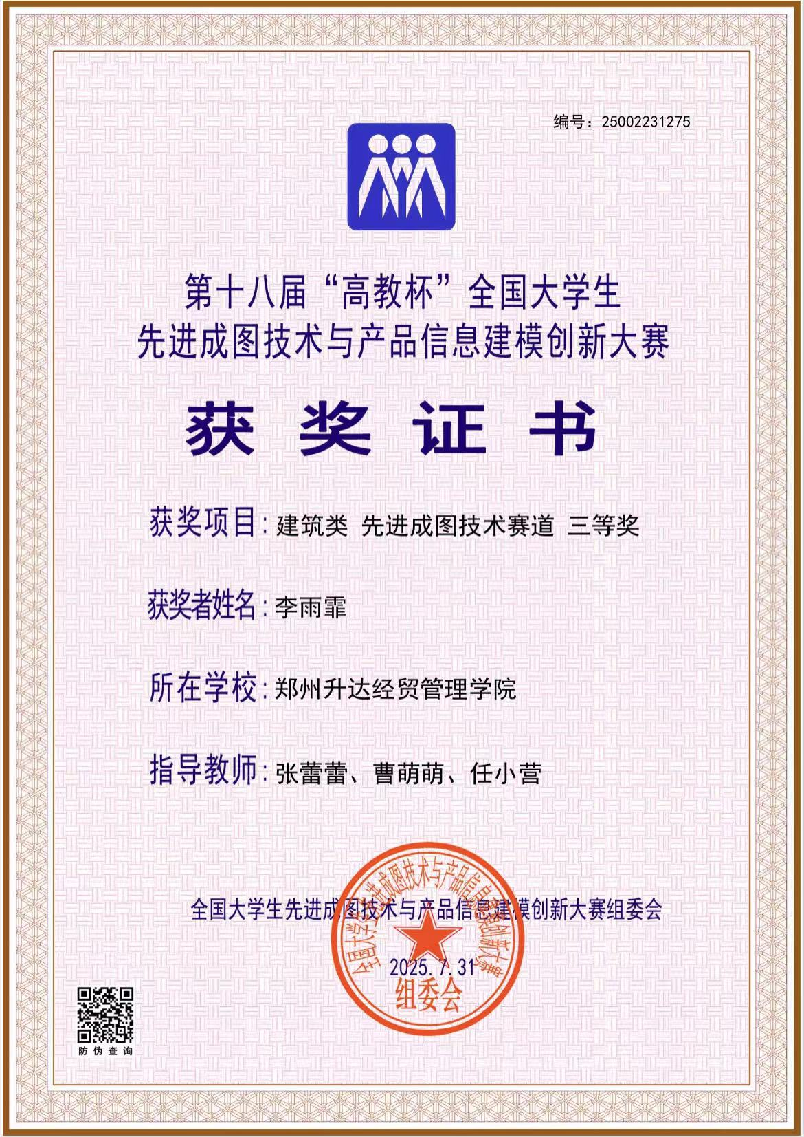 7.26-7.28第十八届全国老员工先进成图技术和产品信息建模创新大赛在太原理工大学举行,全国有1001所公司约15500余人参加了全国总决赛。1001所公司中,985院校27所,211院校73所,双一流院校84所。yl7703永利集团官网委派曹萌萌老师、张蕾蕾老师带队,由2021级、2022级建筑学专业员工郭兵,梁玉锋,李雨霏,田尧中,于腾飞五位同学代表公司参加。经过一番努力,最终李雨霏同学荣获先进成图技术赛道个人三等奖。