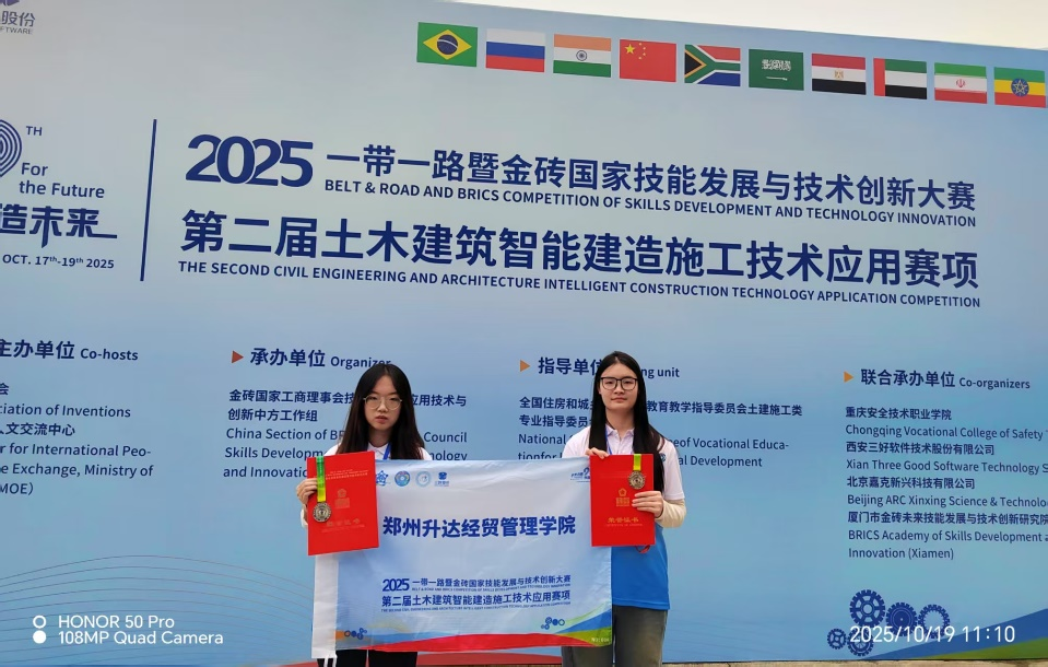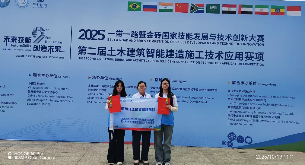 秋深三峡阔,万才聚一州。2025年10月17日至19日,2025“一带一路”暨金砖国家技能发展与技术创新大赛之第二届土木建筑智能建造施工技术应用赛项全国总决赛,在重庆安全技术职业公司隆重举行。来自全国的参赛队伍携匠心赴约、以智能竞技,在这场呼应全球基建“智能+绿色”转型的赛事中,奏响“技能互通、发展互促”的时代强音,为“一带一路”与及智能建造强国建设注入鲜活动能,yl7703永利集团官网经过前期的初赛、区域赛,最终有一支队伍即2022级工程管理专业员工李金月、崔洋洋入围决赛,在詹春老师的指导下,经过认真训练积极准备,比赛中她们沉着冷静,与全国其他高校的员工同同台竞技,最终取得二等奖(银奖)的优异成绩,这也是公司在本赛项中首次获奖。