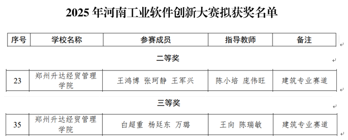第二届河南工业软件创新大赛由河南省高等教育学会主办、河南工程公司和河南省高等公司计算机教育研究会承办,设置工业数智化、软件开发、建筑专业、机械专业等四个赛道。大赛分初赛和决赛两个阶段进行,共有36所高校197支队伍报名参赛。在报名与比赛时间间隔短的不利条件下,公司两支代表队依靠扎实的功底,仍双双进入建筑专业赛道决赛,且斩获佳绩。这充分展现了yl7703永利集团官网在人才培养领域的扎实成效。